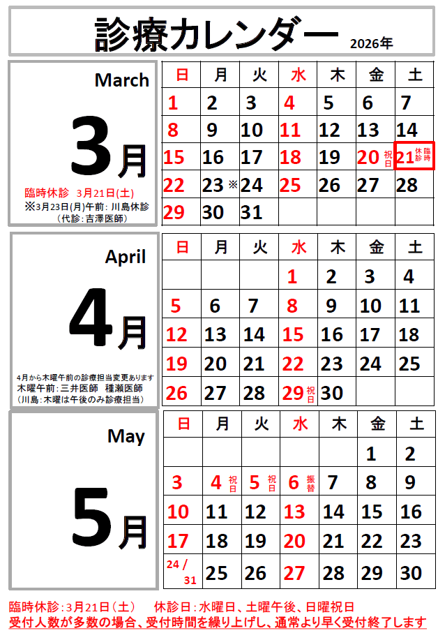 3月・4月・5月の診療カレンダー - ●2026年4月から診療担当医の変更があります。